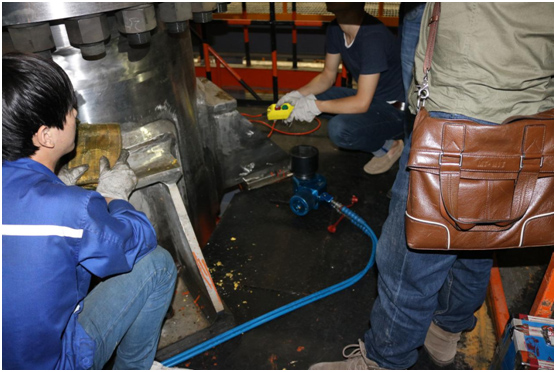 現(xiàn)場工作人員非常認真地與波霆機械工程師進行交流、探討以及學習液壓扳手的正確操作方法。培訓剛剛結束大家就開始忙碌起來,對應兩個法蘭現(xiàn)場工人分成兩組,每組三個人,采用兩同步拆卸螺栓。